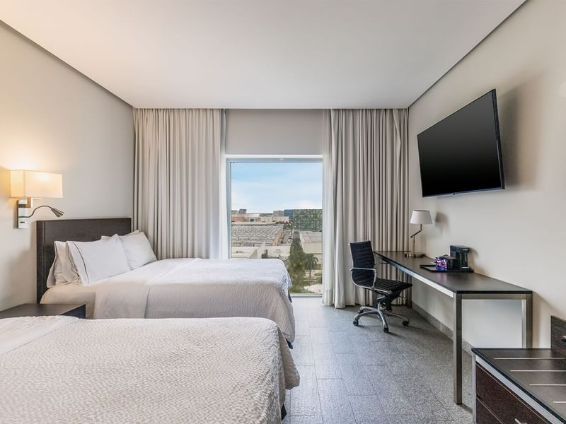 Un espacio que te invita a salir de la rutina y a la relajación. Desconéctate en tu habitación, tienes todo para pasarla bien. Deseamos que descanses en las suaves camas matrimoniales. Solicita algo delicioso a room service o toma un baño disfrutable, nos gusta que te consientas.