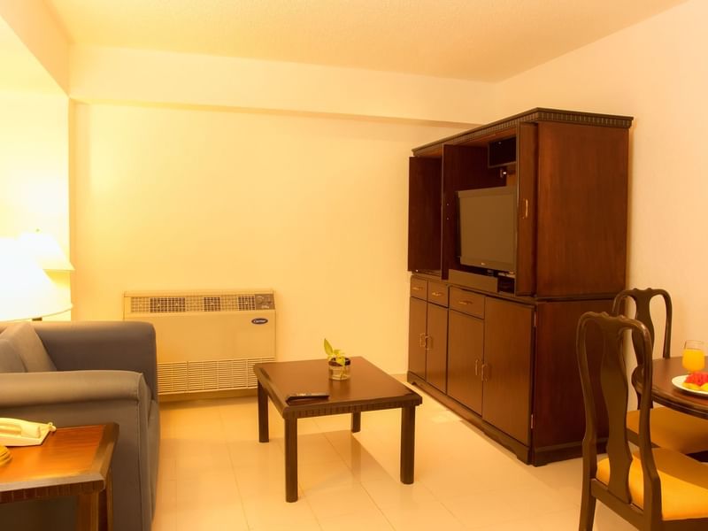 Aprovecha la amplitud de tu suite para lograr cada uno de tus objetivos. Queremos verte triunfar y por eso te apoyamos brindándote con un ambiente cálido y un mobiliario cómodo, te ayudará a cumplir tus planes. Ten un sueño reparador y descansa profundamente en una cama King Size. Solicita a room service lo que desees del menú, y disfruta del comedor o la privacidad de tu sala, mientras continúas revisando tus pendientes. Haz una pausa, mira tu serie, película o programa favorito en nuestra TV, toma un baño o recuéstate en el confortable sillón.