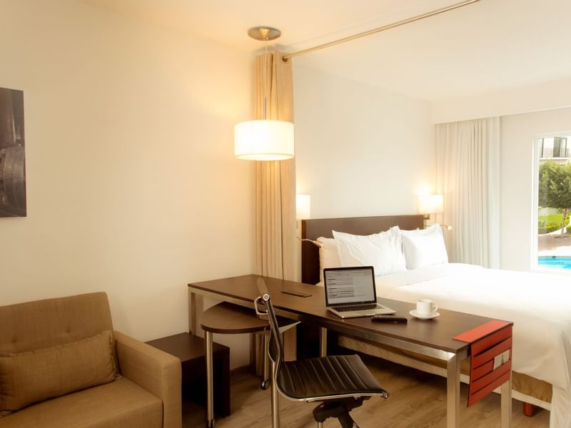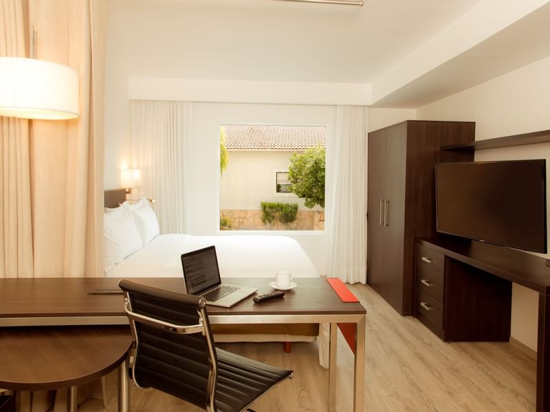 Siéntete como en casa y encuentra el espacio que más te guste para ser productivo. Aprovecha la amplitud de este Loft para ser productivo. El ambiente es cálido y el mobiliario, cómodo y funcional. Ten un sueño reparador y descansa profundamente en la cama King Size. Solicita a room service lo que desees del menú, o decide hacer uso de la cocineta que incluye horno de microondas, frigobar y antecomedor. Haz una pausa, mira tu serie, película o programa favorito en nuestra TV, tomar un baño o recostarte en el confortable sillón.