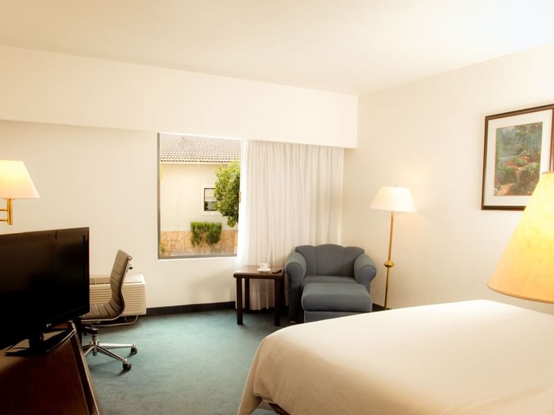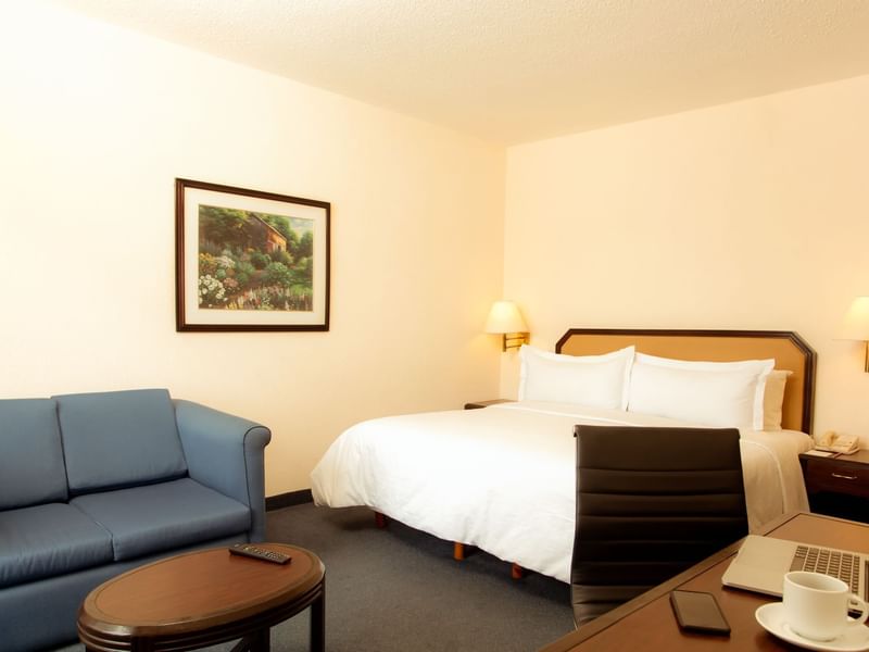 Continúa con tus objetivos en tu habitación, sé productivo en un espacio acogedor. El ambiente es cálido y el mobiliario cómodo, te ayudará a cumplir tus planes. Ten un sueño reparador y descansa profundamente en la cama King Size. Solicita a room service lo que desees del menú, mientras continúas revisando tus pendientes. Haz una pausa, mira tu serie, película o programa favorito en nuestra TV, toma un baño o recuéstate en el confortable sillón.
