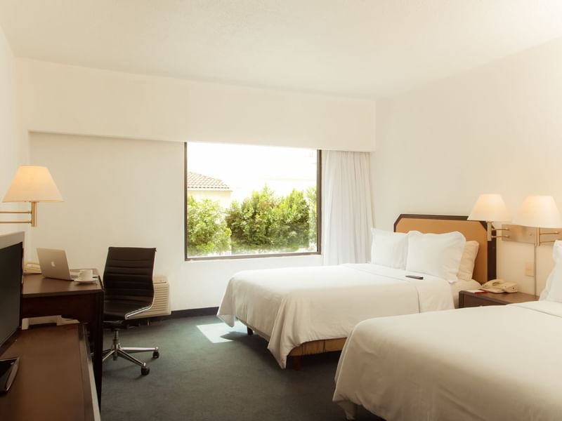 Tu habitación está diseñada para que puedas ser productivo. El ambiente es cálido y el mobiliario cómodo, te ayudará a cumplir tus planes. Queremos verte triunfar. Ten un sueño reparador y descansa profundamente en cualquiera de las camas matrimoniales. Solicita a room service lo que desees del menú, mientras continúas revisando tus pendientes. Haz una pausa, mira tu serie, película o programa favorito en nuestra TV, toma un baño o recuéstate en el confortable sillón.