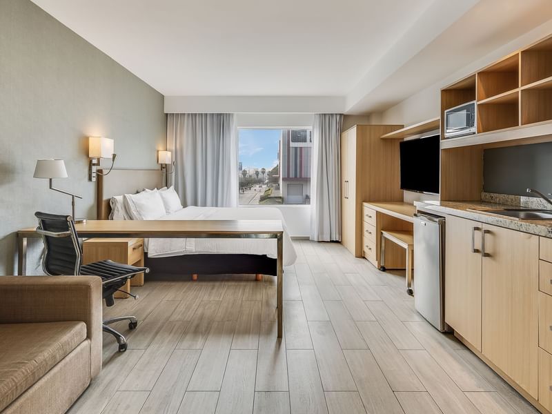 Siéntete como en casa en este espacioso Loft, donde tendrás lo que requieres para ser productivo. Aprovecha la amplitud de este espacioso Loft para cumplir tu objetivos. El ambiente es cálido y el mobiliario, cómodo y funcional. Prepárate para descansar profundamente en la suave cama King Size o revisa tus objetivos en un amplio escritorio de trabajo con lámpara y silla ejecutiva. Disfruta de nuestro room service o utiliza la cocineta que incluye horno de microondas, frigobar y antecomedor. Haz una pausa, transmite tu serie favorita desde tu dispositivo a la pantalla de TV, toma un baño o recuéstate en el confortable sillón.