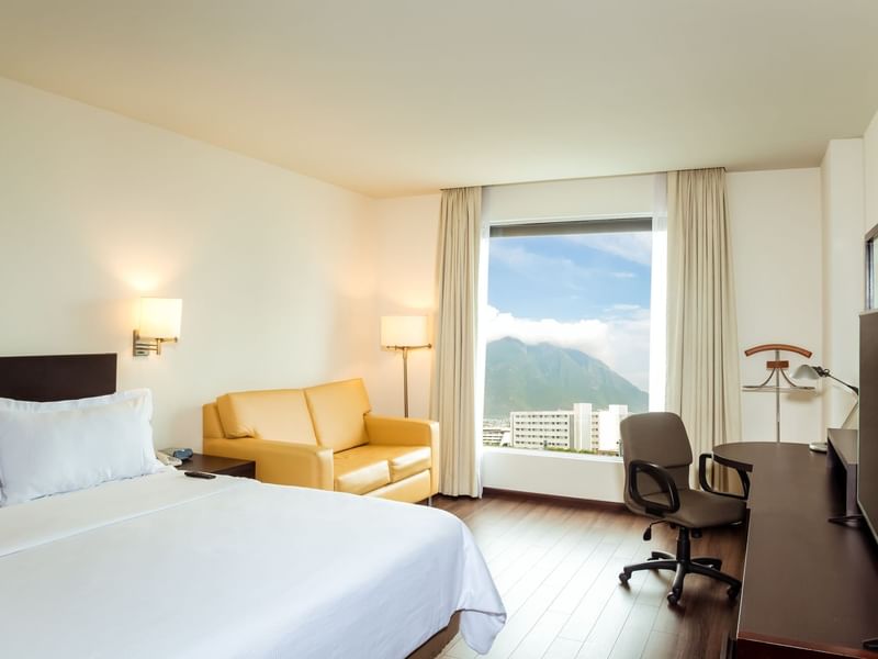 Desconéctate en tu habitación. Relájate después de un día lleno de actividades. El ambiente es cálido y el mobiliario cómodo. Deseamos que descanses en la suave cama King Size y te recuestes en el confortable sillón. Solicita algo delicioso a room service, mientras transmites tu serie favorita desde tu dispositivo a la pantalla de TV. Toma un baño disfrutable. Nos gusta que te consientas.