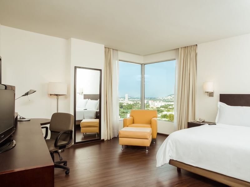 Cuando llega el momento de salir de la rutina, quédate en esta suite que tiene lo que necesitas para una total relajación. Su amplitud te brinda una estancia con sala y comedor en un ambiente cálido y cómodo. Deseamos que descanses en la suave cama King Size y te recuestes en el confortable sillón. Solicita algo delicioso a room service, mientras eliges qué ver en la TV. Toma un baño disfrutable. Desconéctate y diviértete.