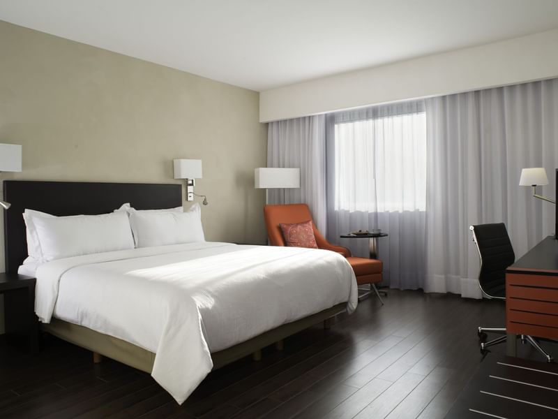 Desconéctate de todo con la seguridad de una habitación pensada para ti. Cada espacio fue creado para tu comodidad y un óptimo desplazamiento. Deseamos que descanses en cama King y te recuestes en el confortable sillón. Solicita algo delicioso a room service, mientras transmites tu serie favorita desde tu dispositivo a la pantalla de TV. Toma un baño disfrutable. Siéntete tranquilo con la barra de seguridad de la regadera, escusado elevado con agarraderas y puerta ancha.