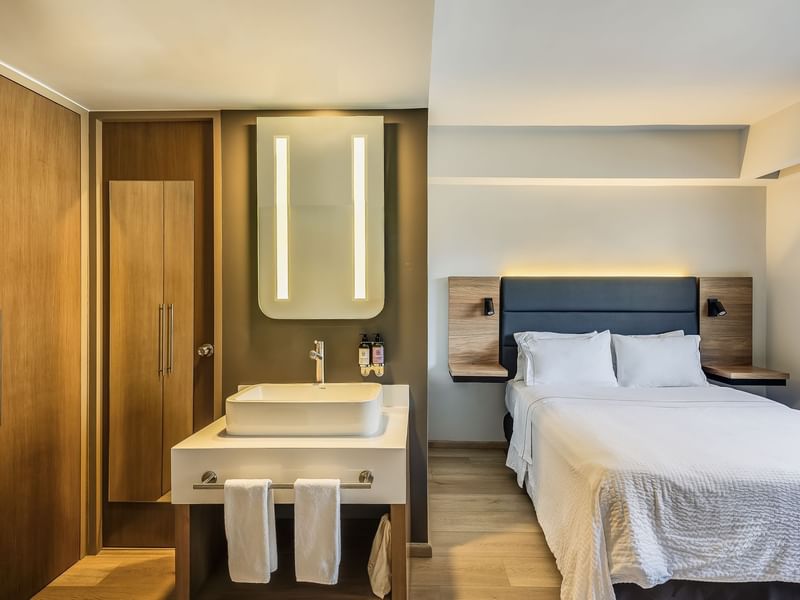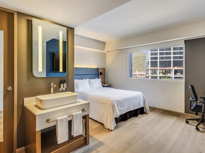 Habitación con espacio más acogedor para tener una estancia de descanso con una cama matrimonial, acompañado de su pantalla de TV para ver sus programas favoritos, asi como una regadera con una relajante ducha para tener un gran descanso.