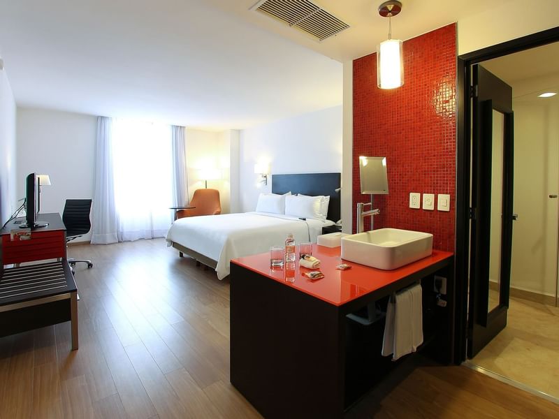 Déjese consentir por cada detalle de esta habitación, que le ofrece cama King Size, aire acondicionado, calefacción, baño completo, clóset con caja de seguridad, plancha y tabla para planchar, teléfono, TV por cable, internet inalámbrico, microondas, refrigerador pequeño, sillón de descanso y amenidades especiales.
