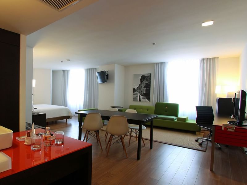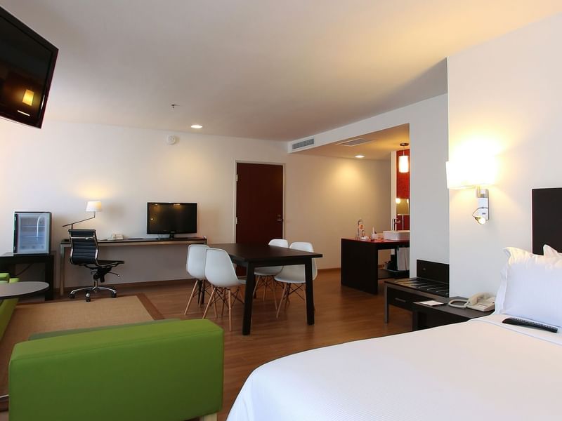 Aprovecha la amplitud de tu suite para lograr cada uno de tus objetivos. Queremos verte triunfar y por eso te apoyamos brindándote un ambiente cálido y un mobiliario cómodo, te ayudará a cumplir tus planes. Ten un sueño reparador y descansa profundamente en una cama King Size. Mientras continúas revisando tus pendientes. Haz una pausa, transmite tu serie favorita desde tu dispositivo a la pantalla de TV, toma un baño o recuéstate en el confortable sillón.