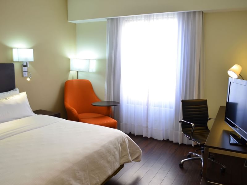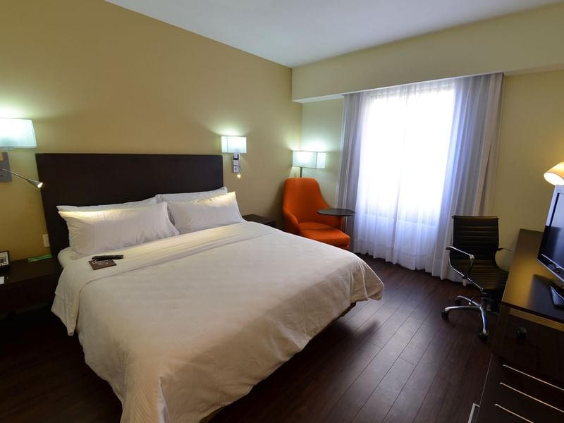 Continúa con tus objetivos en tu habitación, sé productivo en un espacio acogedor. El ambiente es cálido y el mobiliario cómodo, te ayudará a cumplir tus planes. Ten un sueño reparador y descansa profundamente en la cama King Size. Solicita a room service lo que desees del menú, mientras continúas revisando tus pendientes. Haz una pausa, transmite tu serie favorita desde tu dispositivo a la pantalla de TV, toma un baño o recuéstate en el confortable sillón.