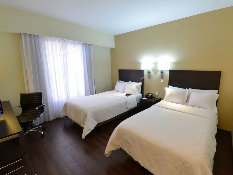 Tu habitación está diseñada para que puedas ser productivo. El ambiente es cálido y el mobiliario cómodo, te ayudará a cumplir tus planes. Queremos verte triunfar. Ten un sueño reparador y descansa profundamente en cualquiera de las camas matrimoniales. Solicita a room service lo que desees del menú, mientras continúas revisando tus pendientes. Haz una pausa, transmite tu serie favorita desde tu dispositivo a la pantalla de TV, toma un baño o recuéstate en el confortable sillón.