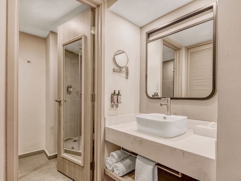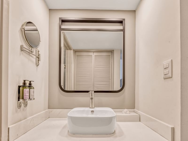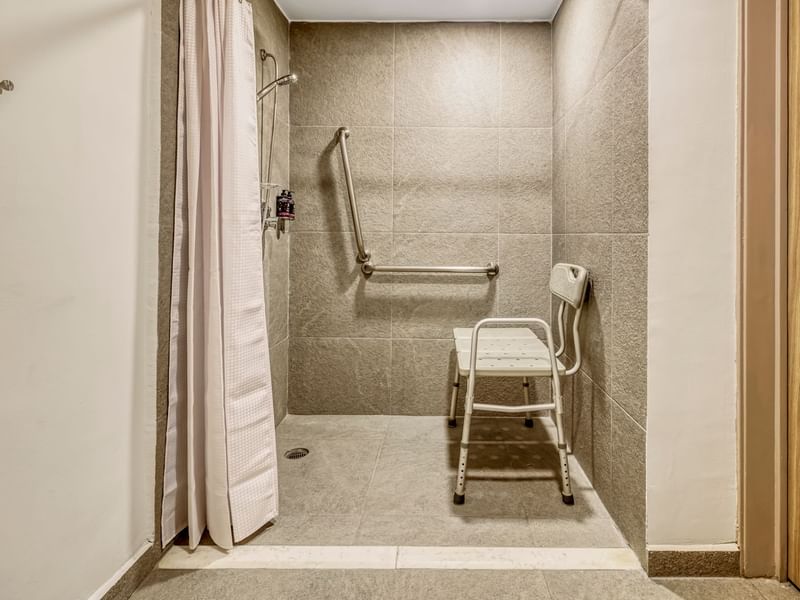 Desconéctate de todo con la seguridad de una habitación pensada para ti. Cada espacio fue creado para tu comodidad y un óptimo desplazamiento. Deseamos que descanses en la suave cama Queen y te recuestes en el confortable sillón. Solicita algo delicioso a room service, mientras transmites tu serie favorita desde tu dispositivo a la pantalla de TV. Toma un baño disfrutable. Siéntete tranquilo con la barra de seguridad de la regadera, escusado elevado con agarraderas y puerta ancha.