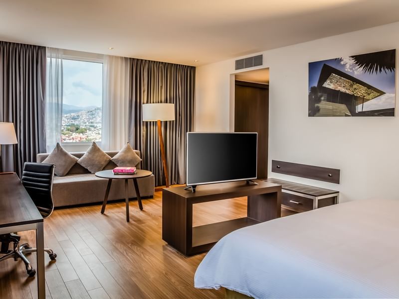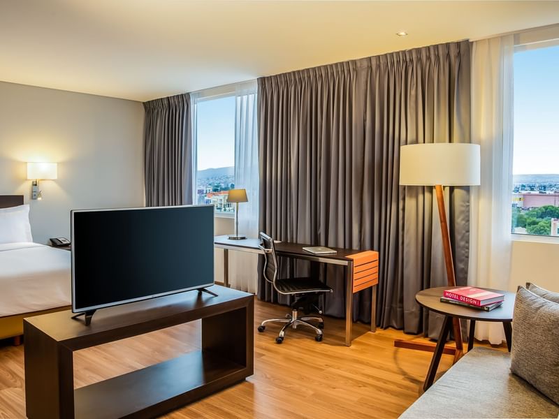 Tu suite te espera para tener días de productividad y logros, con noches relajantes. Aquí lograrás un balance cuando lo decidas. Reconfórtate con la amplitud de esta suite que te ofrece sala, comedor y cocineta. El ambiente es cálido, el mobiliario cómodo y funcional. Recuéstate en tu confortable sillón y solicita a room service lo que desees del menú, mientras ves la TV. Prepárate para descansar profundamente en la suave cama King Size. Si requieres continuar con tus pendientes, puedes elegir el escritorio.