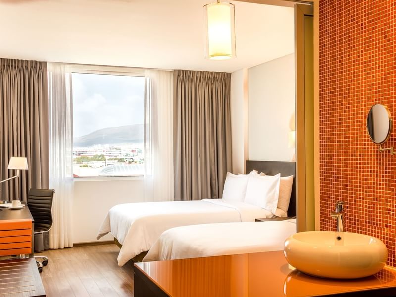 Recupera tu equilibrio en esta habitación. Todo está dispuesto para que tengas noches plenas y días productivos. El ambiente es cálido, el mobiliario cómodo y funcional. Prepárate para descansar profundamente en cualquiera de las dos camas matrimoniales. Haz una pausa y solicita a room service lo que desees del menú mientras ves la TV. Después de un día lleno de logros, toma un baño disfrutable. Si requieres continuar con tus pendientes, puedes hacerlo desde tu habitación.