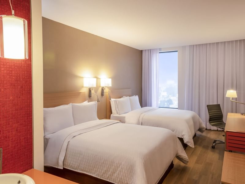 Recupera tu equilibrio en esta habitación. Todo está dispuesto para que tengas noches plenas y días productivos. El ambiente es cálido, el mobiliario cómodo y funcional. Prepárate para descansar profundamente en cualquiera de las dos camas matrimoniales. Haz una pausa y solicita a room service lo que desees del menú mientras transmites tu serie favorita desde tu dispositivo a la pantalla de TV. Después de un día lleno de logros, toma un baño disfrutable. Si requieres continuar con tus pendientes, puedes hacerlo desde tu confortable sillón.