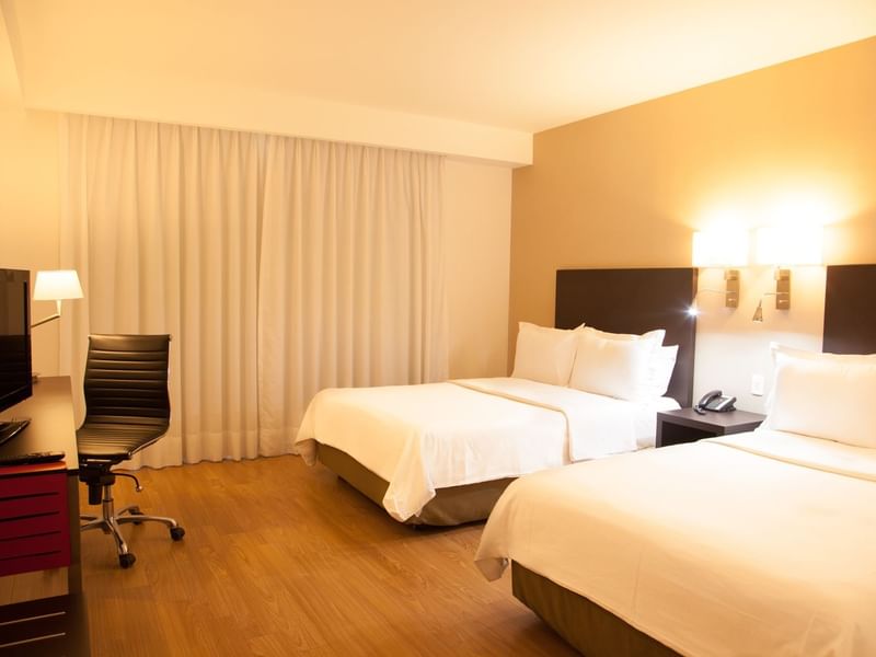 En este espacio todo está dispuesto para que elijas descansar o lograr la productividad necesaria. Sentirás como alcanzas el equilibrio en tu habitación. El ambiente es cálido y el mobiliario, cómodo y funcional. Prepárate para descansar profundamente en cualquiera de las dos camas matrimoniales. Solicita a room service lo que desees del menú, mientras ves la TV. Después de un día lleno de logros, toma un baño disfrutable. Si requieres continuar con tus pendientes, puedes hacerlo desde tu confortable sillón.