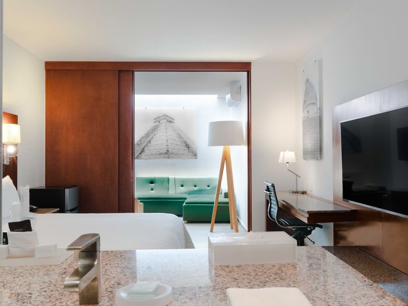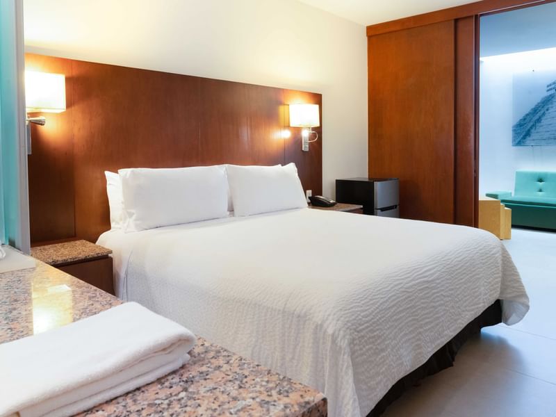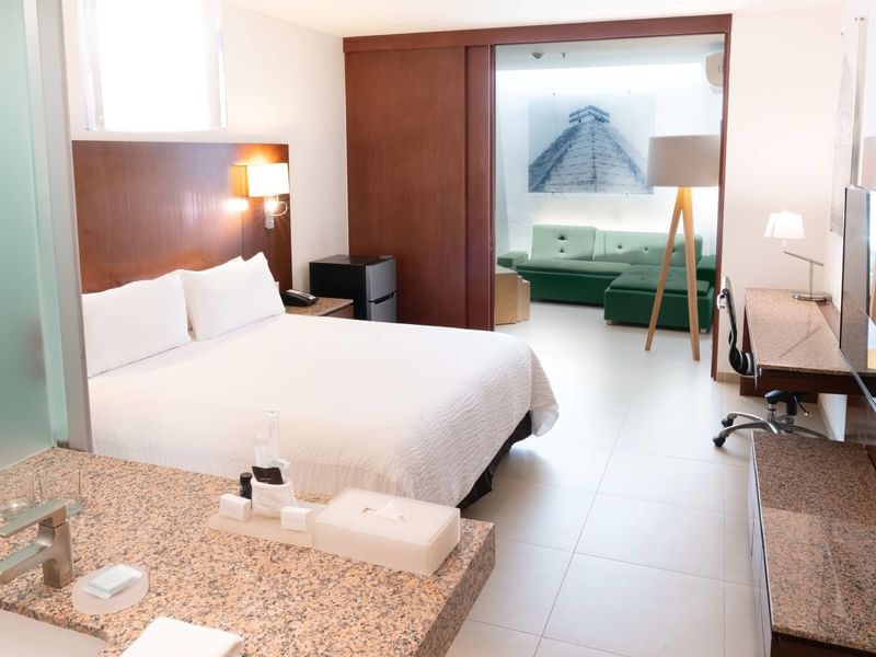 El ambiente relajado y moderno de esta suite, con amenidades especiales que le agregan valor a tu experiencia, te ayudará a despejar tu mente, por si tienes que terminar algún pendiente, solo relájate en la cama King Size, disfrutando de la TV, escuchando tu música favorita o leyendo algún libro. Encuentra el balance y disfruta tu estancia gracias al mobiliario funcional y agradable de esta habitación.