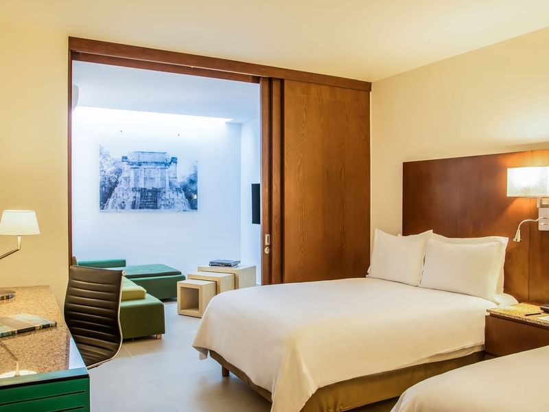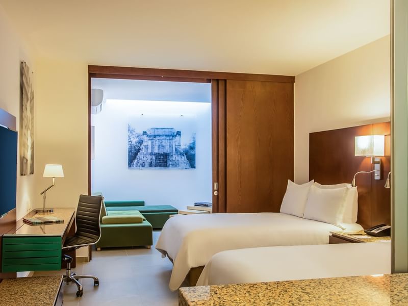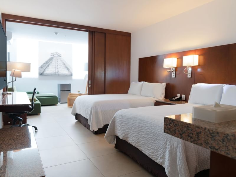 El ambiente relajado y moderno de esta suite, con amenidades especiales que le agregan valor a tu experiencia, te ayudará a despejar tu mente, por si tienes que terminar algún pendiente, solo relájate en las dos camas dobles, disfrutando de la TV, escuchando tu música favorita o leyendo algún libro. Encuentra el balance y disfruta tu estancia gracias al mobiliario funcional y agradable de esta habitación.