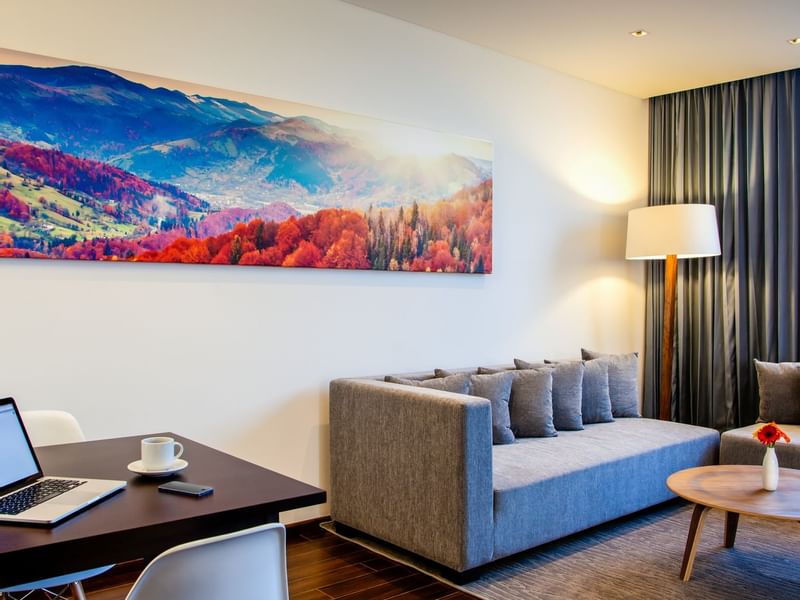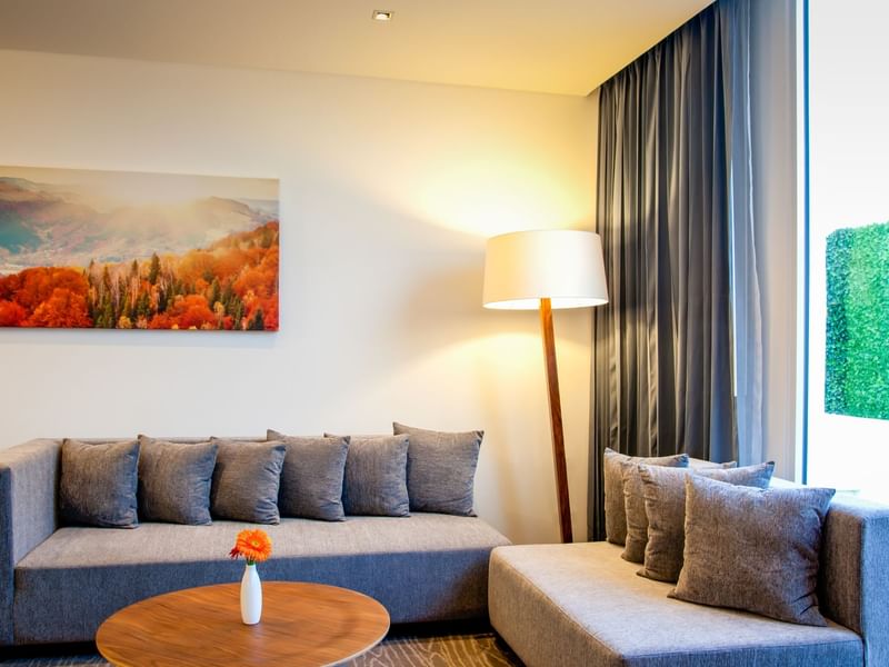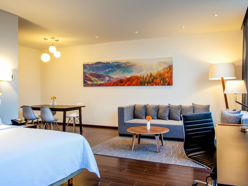 Aprovecha la amplitud de tu suite para lograr cada uno de tus objetivos. Queremos verte triunfar y por eso te apoyamos brindándote un ambiente cálido y un mobiliario cómodo, te ayudará a cumplir tus planes. Ten un sueño reparador y descansa profundamente en una cama King Size. Solicita a room service lo que desees del menú, y disfruta del comedor o la privacidad de tu sala, mientras continúas revisando tus pendientes. Haz una pausa, transmite tu serie favorita desde tu dispositivo a la pantalla de TV, toma un baño o recuéstate en el confortable sillón.