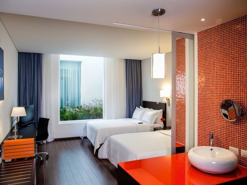 Tu habitación está diseñada para que puedas ser productivo. El ambiente es cálido y el mobiliario cómodo, te ayudará a cumplir tus planes. Queremos verte triunfar. Ten un sueño reparador y descansa profundamente en cualquiera de las camas matrimoniales. Solicita a room service lo que desees del menú, mientras continúas revisando tus pendientes. Haz una pausa, transmite tu serie favorita desde tu dispositivo a la pantalla de TV, toma un baño o recuéstate en el confortable sillón.