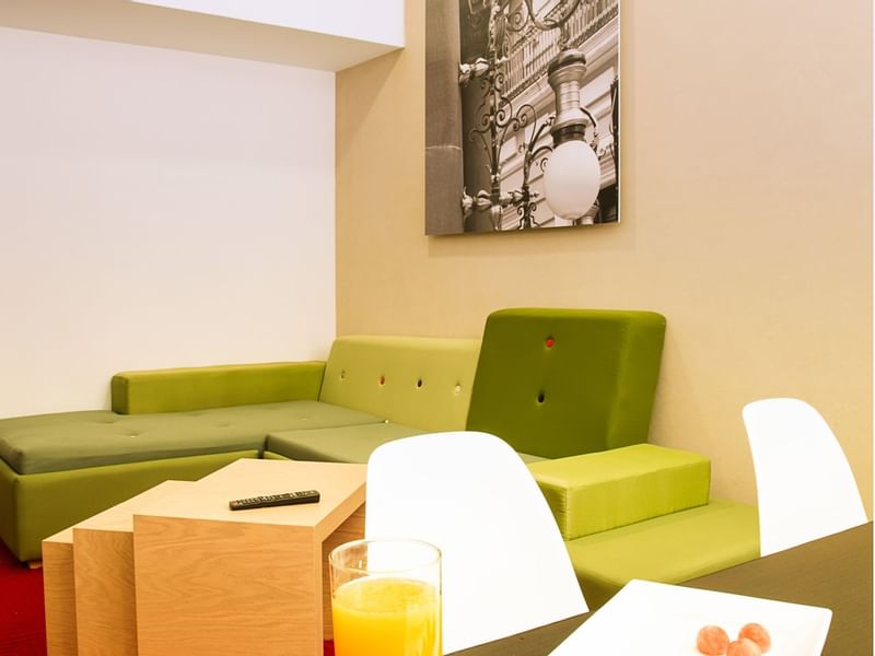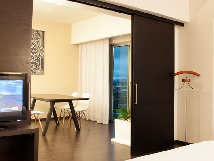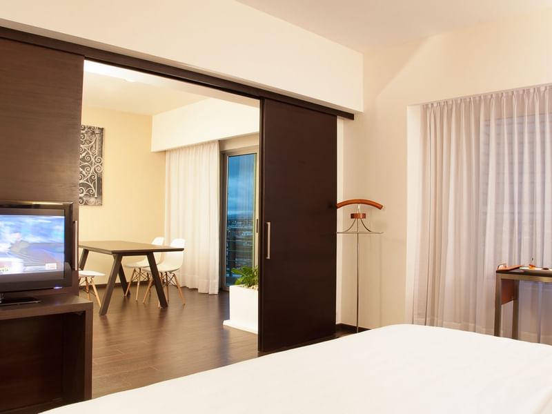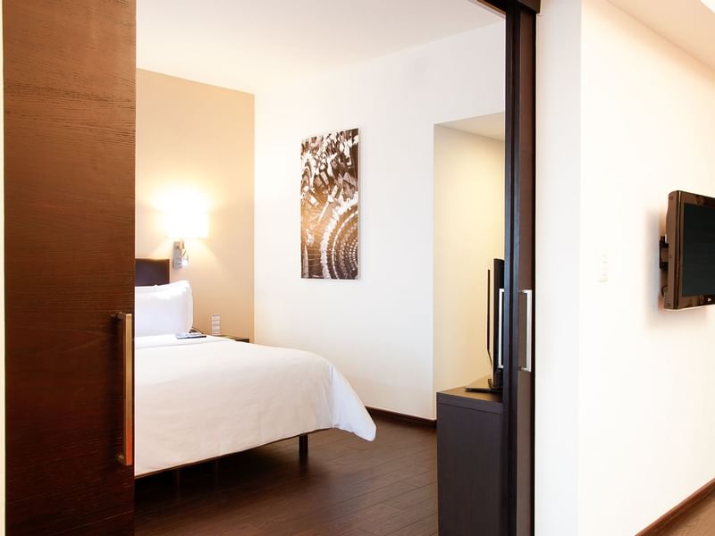 Tu suite te espera para tener días de productividad y logros, con noches relajantes. Aquí lograrás un balance, desconéctate o sé activo cuando lo decidas. Reconfórtate con la amplitud de esta suite que te ofrece sala, comedor y balcón. El ambiente es cálido, el mobiliario cómodo y funcional. Recuéstate en tu confortable sillón y solicita a room service lo que desees del menú, mientras transmites tu serie favorita desde tu dispositivo a la pantalla de TV. Prepárate para descansar profundamente en la suave cama King Size. Si requieres continuar con tus pendientes, puedes elegir el escritorio.