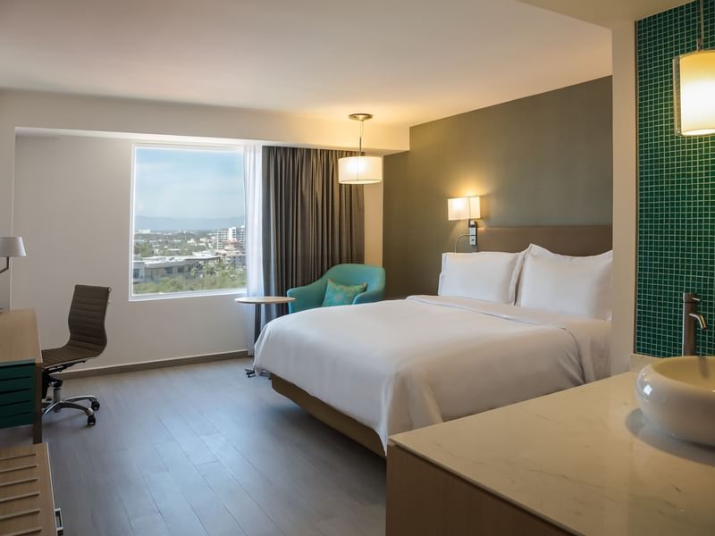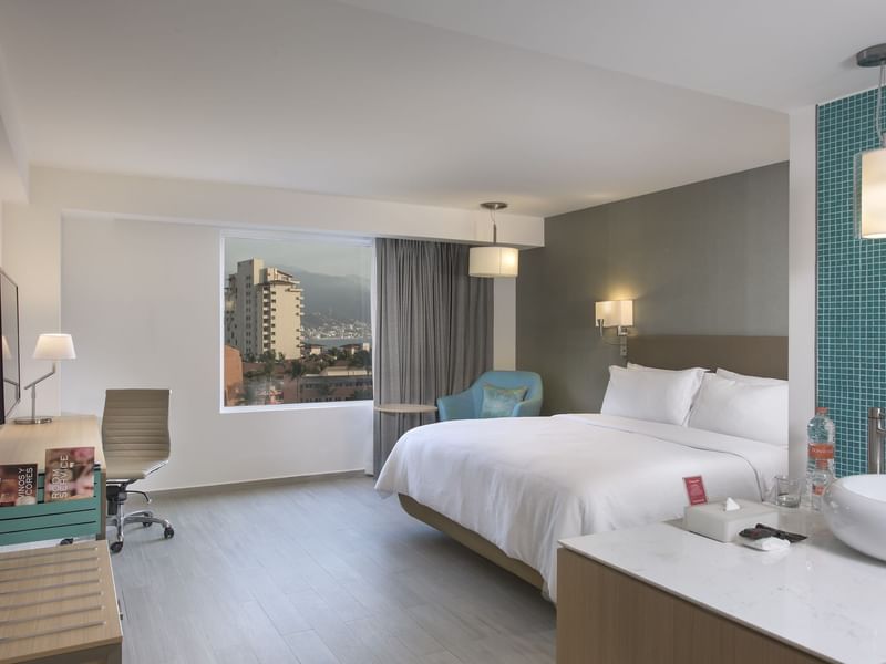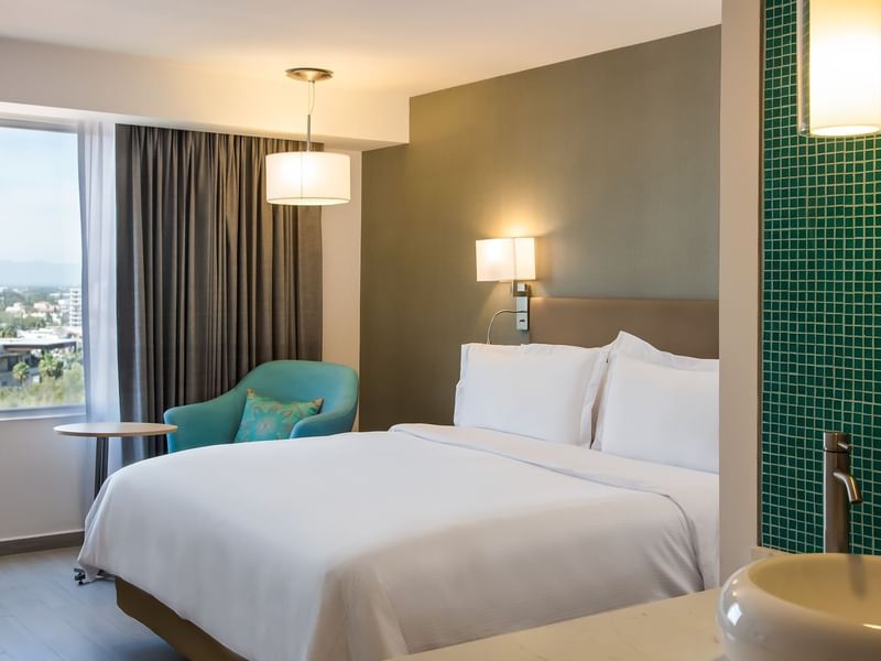 Desconéctate en tu habitación. Relájate después de un día lleno de actividades. El ambiente es cálido y el mobiliario cómodo. Deseamos que descanses en la suave cama King Size y te recuestes en el confortable sillón. Solicita algo delicioso a room service, mientras ves TV. Toma un baño disfrutable. Nos gusta que te consientas.