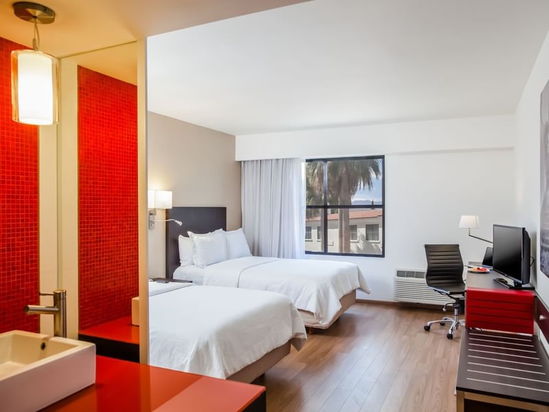 Facilitamos tu productividad con una habitación que te permite trabajar cuando lo desees. El ambiente de esta habitación es cálido y el mobiliario cómodo; te ayudará a cumplir tus planes. Ten un sueño reparador y descansa profundamente en cualquiera de las camas matrimoniales. Solicita a room service lo que desees del menú, mientras continúas revisando tus pendientes. Haz una pausa, transmite tu serie favorita desde tu dispositivo a la pantalla de TV, toma un baño o recuéstate en el confortable sillón.