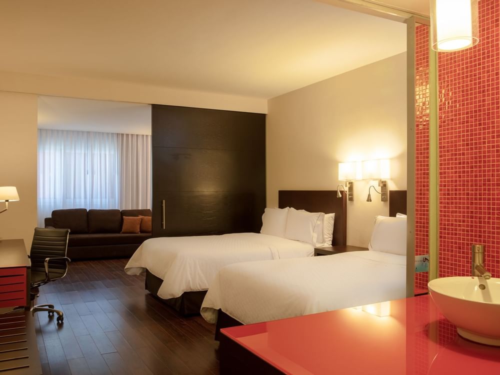 Encontrarás en nuestras habitaciones todo para descansar y relajarte, así como para trabajar, estudiar o dedicar tiempo a tus objetivos. Elige estar en tu habitación en cualquier momento del día para recuperar tu equilibrio. Vive un alojamiento en San Luis Potosí donde el más mínimo detalle está dispuesto para ti. Pide algo delicioso de nuestro room service, toma un baño, continúa viendo tu programa o serie favorita. Conéctate o desconéctate. Tú decides.