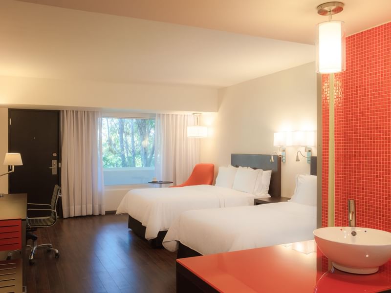 En este espacio todo está dispuesto para que elijas descansar o lograr la productividad necesaria. Sentirás como alcanzas el equilibrio en tu habitación. El ambiente es cálido, el mobiliario cómodo y funcional. Prepárate para descansar profundamente en cualquiera de las dos camas matrimoniales. Solicita a room service lo que desees del menú, mientras transmites tu serie favorita desde tu dispositivo a la pantalla de TV. Después de un día lleno de logros, toma un baño disfrutable. Si requieres continuar con tus pendientes, puedes hacerlo desde tu confortable sillón.