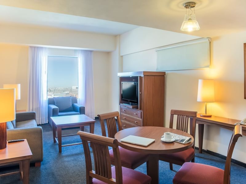 El ambiente relajado y moderno de esta suite, con amenidades especiales que le agregan valor a tu experiencia, te ayudará a despejar tu mente, por si tienes que terminar algún pendiente, solo relájate en la cama King Size, disfrutando de la TV, escuchando tu música favorita o leyendo algún libro. Encuentra el balance y disfruta tu estancia gracias al mobiliario funcional y agradable de esta habitación.