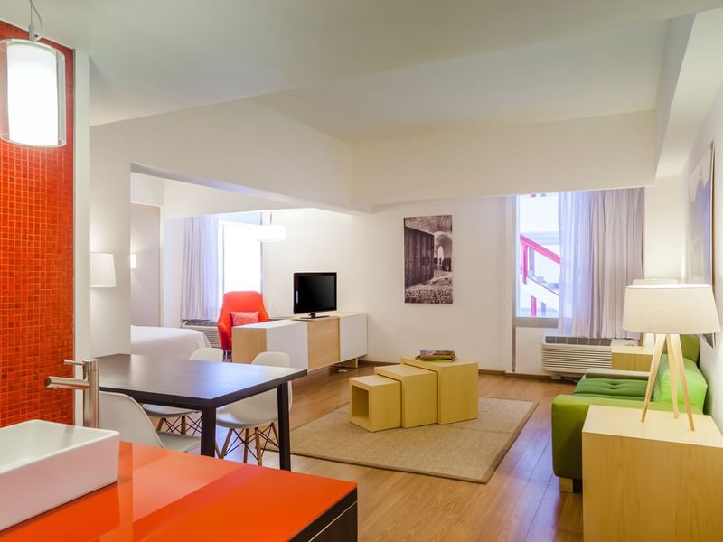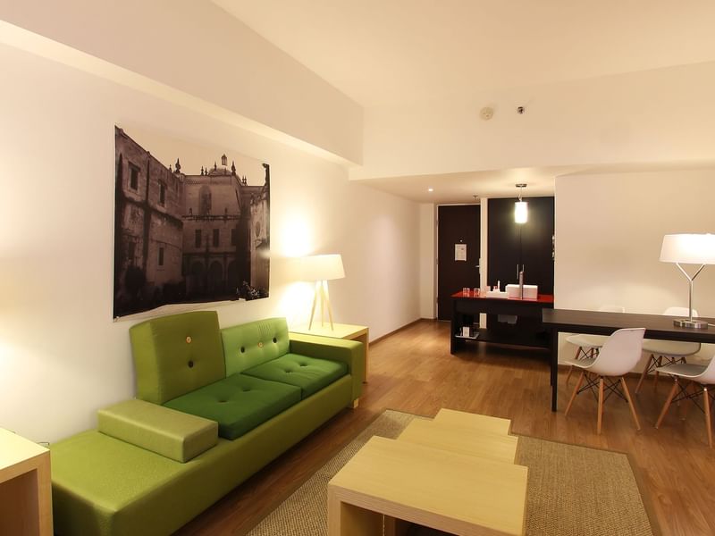 Aprovecha la amplitud de tu suite para lograr cada uno de tus objetivos. Queremos verte triunfar y por eso te apoyamos brindándote un ambiente cálido y un mobiliario cómodo, te ayudará a cumplir tus planes. Ten un sueño reparador y descansa profundamente en una cama King Size. Solicita a room service lo que desees del menú, y disfruta del comedor o la privacidad de tu sala, mientras continúas revisando tus pendientes. Haz una pausa, transmite tu serie favorita desde tu dispositivo a la pantalla de TV, toma un baño o recuéstate en el confortable sillón.