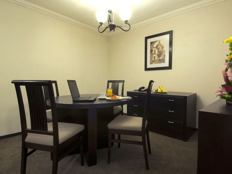 Tu suite te espera para tener días de productividad y logros, con noches relajantes. Aquí lograrás un balance, desconéctate o sé activo cuando lo decidas. Reconfórtate con la amplitud de esta suite que te ofrece sala, comedor y cocineta. El ambiente es cálido, el mobiliario cómodo y funcional. Recuéstate en tu confortable sillón y solicita a room service room service en horario de 6:00 a 23:00 hrs.,lo que desees del menú, mientras transmites tu serie favorita desde tu dispositivo a la pantalla de TV. Prepárate para descansar profundamente en la suave cama King Size. Si requieres continuar con tus pendientes, puedes elegir el escritorio.