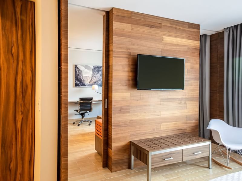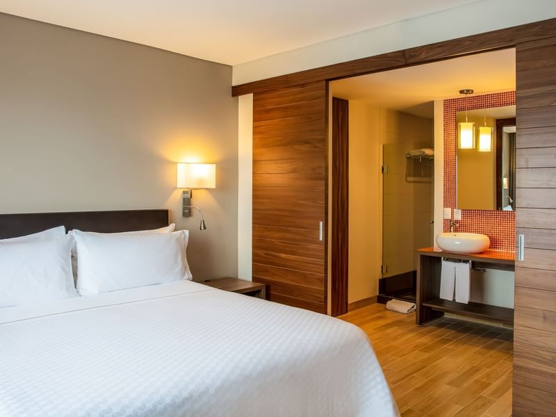 Tu suite te espera para tener días de productividad y logros, con noches relajantes. Aquí lograrás un balance, desconéctate o sé activo cuando lo decidas. Reconfórtate con la amplitud de esta suite que te ofrece sala, comedor y cocineta. El ambiente es cálido, el mobiliario cómodo y funcional. Recuéstate en tu confortable sillón y solicita a room service lo que desees del menú, mientras transmites tu serie favorita desde tu dispositivo a la pantalla de TV. Prepárate para descansar profundamente en la suave cama King Size. Si requieres continuar con tus pendientes, puedes elegir el escritorio.