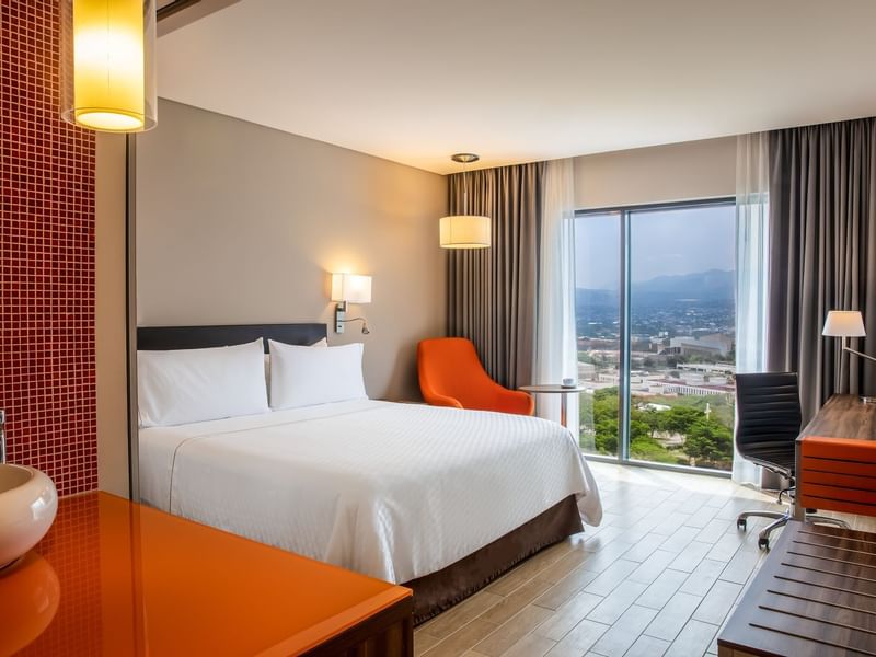 En esta confortable habitación encontrarás un anhelado equilibrio. Creemos en el balance de tu vida, aquí serás productivo o podrás relajarte. El ambiente es cálido, el mobiliario cómodo y funcional. Prepárate para descansar profundamente en la cama King Size. Haz una pausa y solicita a room service lo que desees del menú mientras transmites tu serie favorita desde tu dispositivo a la pantalla de TV. Después de un día lleno de logros, toma un baño disfrutable. Si requieres continuar con tus pendientes, puedes hacerlo desde tu confortable sillón.