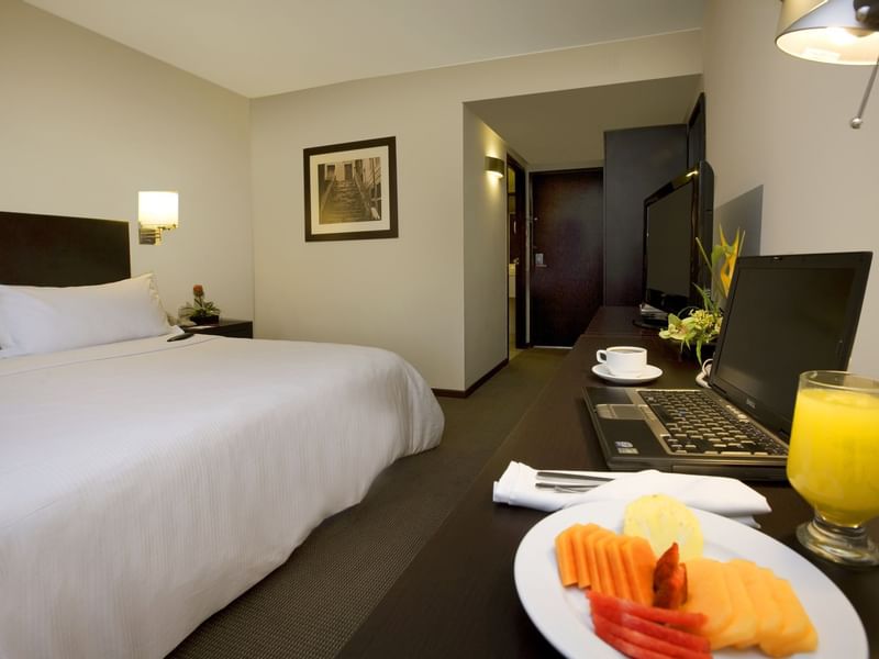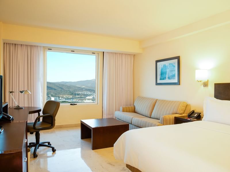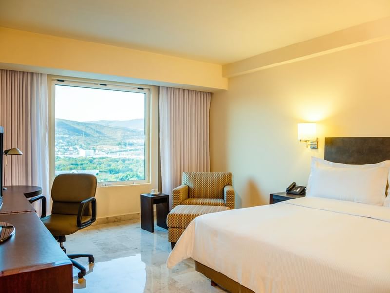 Continúa con tus objetivos en tu habitación, sé productivo en un espacio acogedor. El ambiente es cálido y el mobiliario cómodo, te ayudará a cumplir tus planes. Ten un sueño reparador y descansa profundamente en la cama King Size. Solicita a room service lo que desees del menú, mientras continúas revisando tus pendientes. Haz una pausa, transmite tu serie favorita desde tu dispositivo a la pantalla de TV, toma un baño o recuéstate en el confortable sillón.