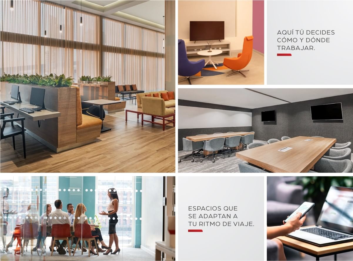 Nuestros espacios versátiles se adaptan a tu forma de trabajar. Ya sea para concentrarte en tus pendientes, conectarte en línea o realizar una reunión, nuestras áreas ofrecen comodidad, conectividad y amenidades pensadas para facilitar presentaciones, videoconferencias y encuentros productivos durante tu estancia.