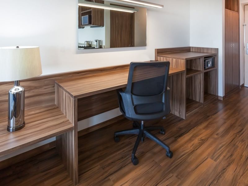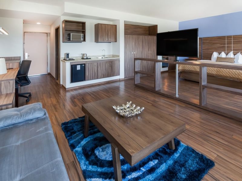 La amplitud y el confort es parte de este diseño que hará que tengas una estancia increíble. Esta suite cuenta con una cama King size y una cómoda área de trabajo con silla ergonómica, sala, cocineta equipada, Smart TV de 46 pulgadas con sistema Sky, ventanas de doble vidrio, amplios baños, piso de madera, caja de seguridad, minibar y acceso gratuito a Internet inalámbrico.