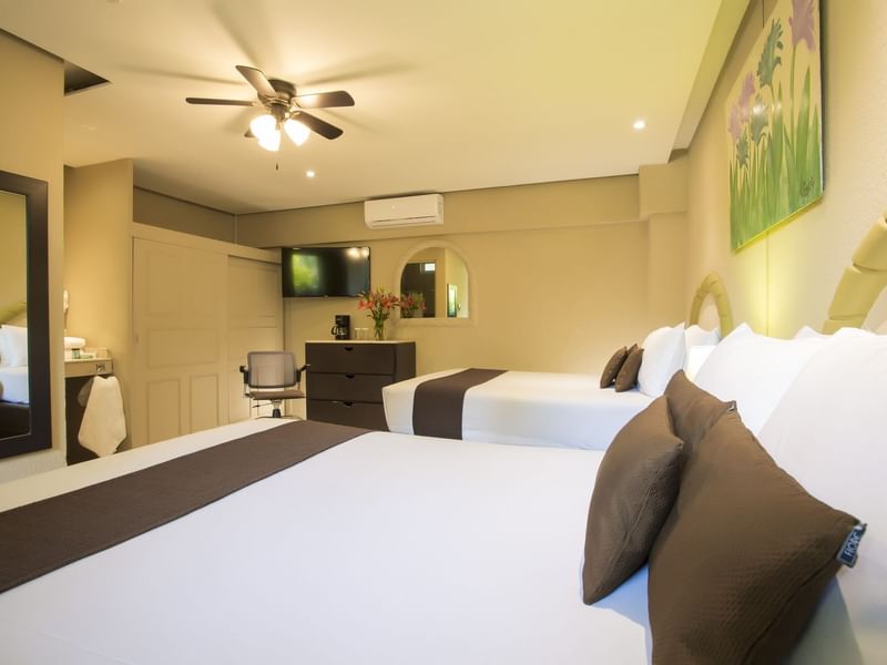 Ideal para compartir un viaje. Esta amplia habitación te brinda espacios encantadores con acentos locales para que disfrutes al máximo tu estancia. Cuenta con dos camas matrimoniales, un escritorio, pantalla plana, WiFi, caja de seguridad, teléfono, baño equipado con regadera y WC.