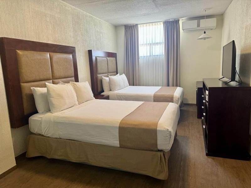 Ideal para compartir un viaje. Esta habitación te brinda espacios encantadores y confortables para que disfrutes al máximo tu estancia. Cuenta con dos camas matrimoniales, aire acondicionado y calefacción, café fresco a la hora que gustes gracias a la cafetera en tu habitación, un baño privado con regadera, WC y secadora de pelo. Además, cuenta una pantalla plana para descansar y relajarte, así como un amplio armario con caja fuerte. Después de explorar la esencia de este destino, te esperamos en Gamma para que continúe tu experiencia.