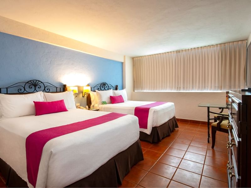 Ideal para compartir un viaje. Esta habitación te brinda espacios encantadores con acentos locales para que disfrutes al máximo tu estancia. Cuenta con dos camas matrimoniales, pantalla de 32" para que pases un buen momento, sillón de lectura, escritorio con amplio espacio de trabajo, teléfono y baño equipado con regadera y WC. Después de explorar la esencia de este destino, te esperamos en Gamma para que continue tu experiencia.