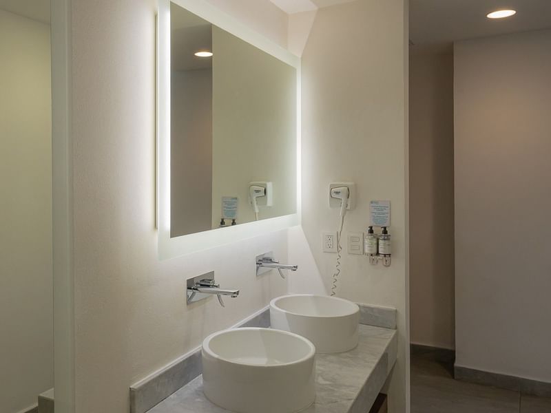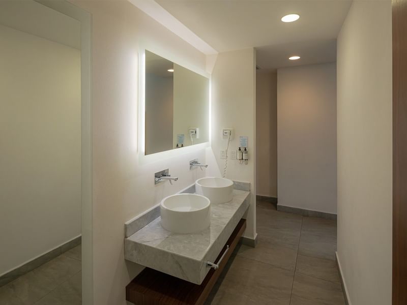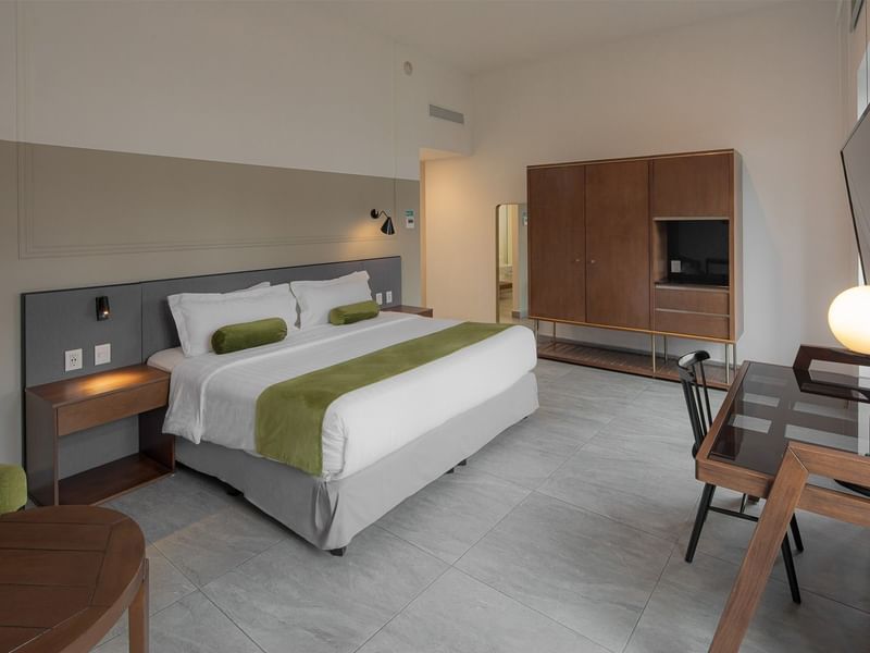 La amplitud y el confort es parte de este diseño que hará que tengas una estancia increíble. La suite cuenta con una cama King size, una sala de estar, amplios balcones que te ofrecen vistas increíbles a la calle principal de la ciudad. Adicional te ofrecemos baño con ducha y doble vanity, pantalla de 55”, doble escritorio, cafetera y kit de café de bienvenida.