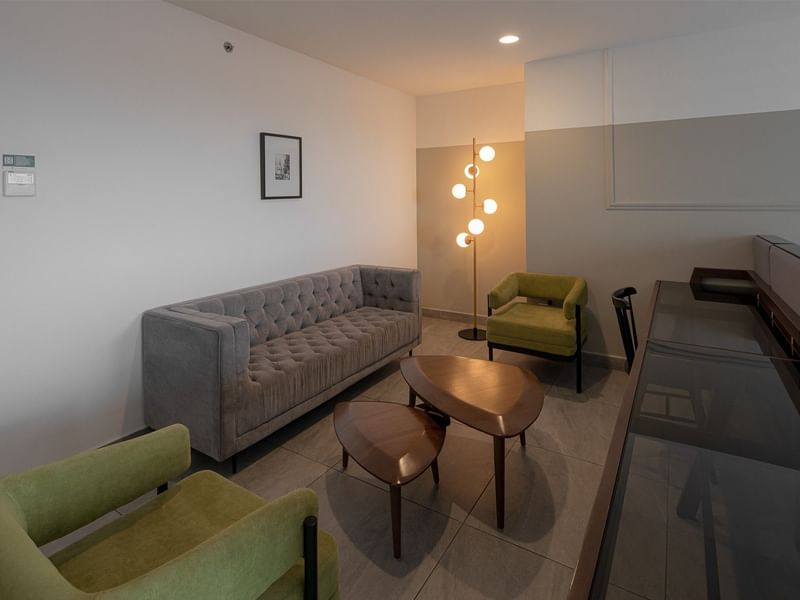 Amplios espacios para compartir hermosos momentos, donde la comodidad y el disfrute son parte de tu estancia. Prueba de ello son sus dos espacios con los que cuenta; el primero ofrece una sala de estar con sillón clásico para pasar una tarde en familia y doble escritorio. La segunda habitación cuenta con una cama king size y pantalla de 55”. Esta suite tiene un doble balcón y sillón con vistas espectaculares al gran Cerro del Borrego. Equipada con cafetera y kit de café de bienvenida. Baño con ducha y doble vanity.