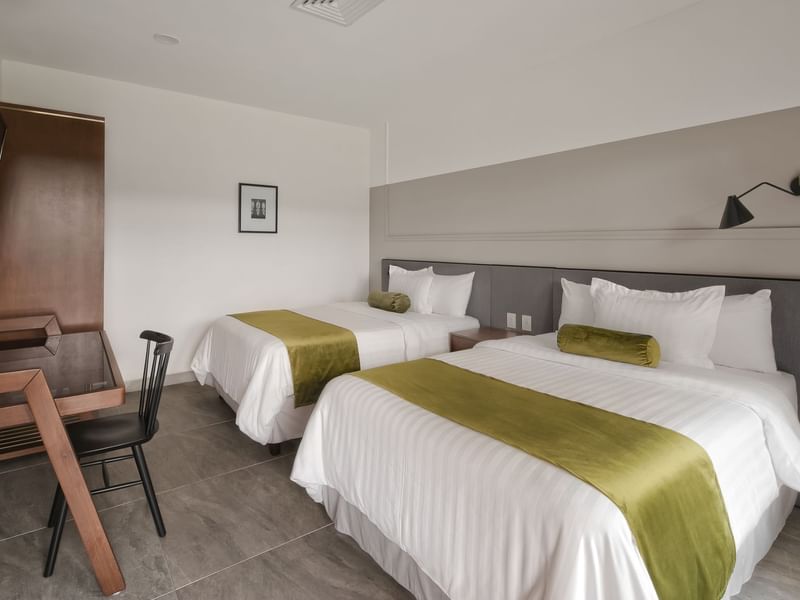 Ideal para compartir un viaje. Esta habitación te brinda espacios encantadores con acentos locales para que disfrutes al máximo tu estancia. Cuenta con vistas espectaculares a la calle principal de la ciudad, dos camas dobles, una pantalla de 55” para que pases un buen momento, escritorio, baño con ducha, amenidades de lujo, cafetera y kit de bienvenida.