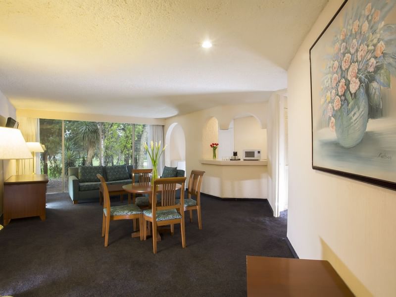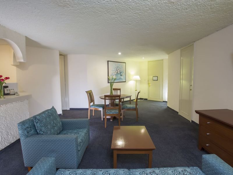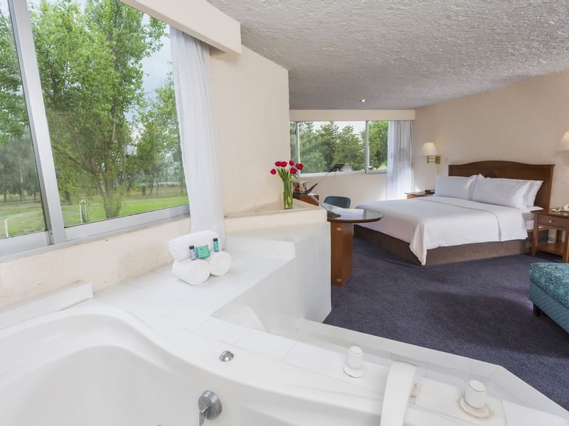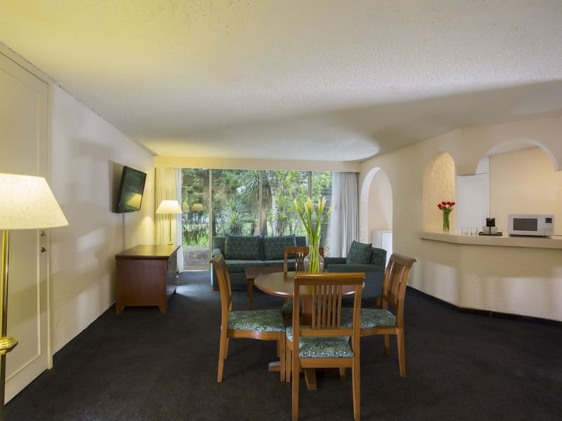 La hermosa vista al Club de Golf será parte de una estancia fascinante. Esta suite decorada con fino estilo en madera, está compuesta por una alcoba con cama King Size, pantalla de 32" y baño completo con tina independiente a la regadera, así como una estancia con sala, otra pantalla de 55", extensión telefónica, internet de alta velocidad, cocineta equipada y medio baño. Después de explorar la esencia de este destino, te esperamos en Gamma para que continue tu experiencia.