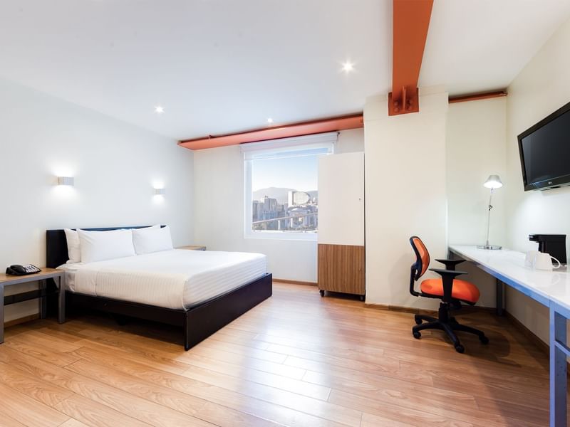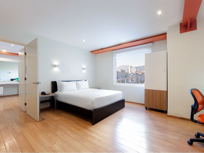 Diseñada con calidez y funcionalidad entendiendo las necesidades de nuestros huéspedes. Nuestra habitación es totalmente amplia sin barreras en sus accesos, equipada con una cama King size, pantalla, caja de seguridad,cafetera, baño con mango y doble lavabo.