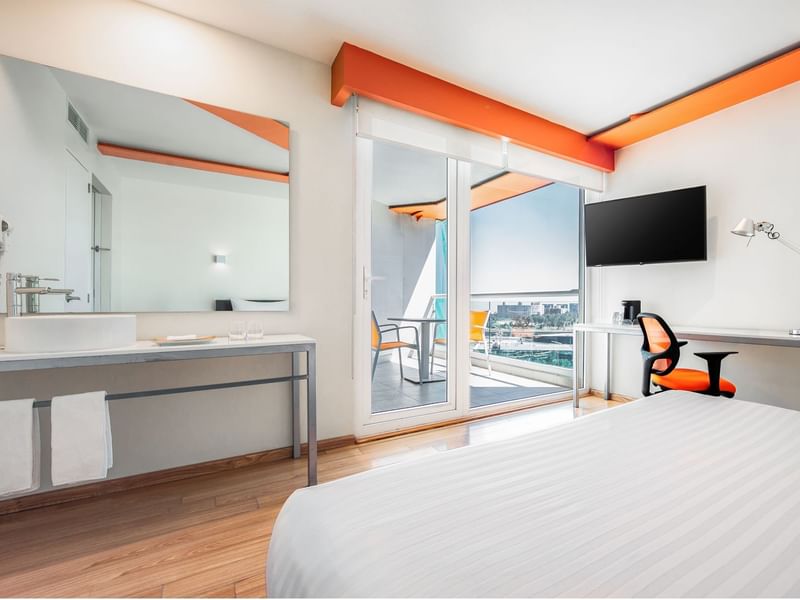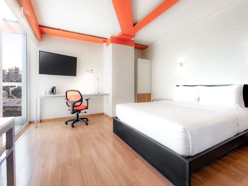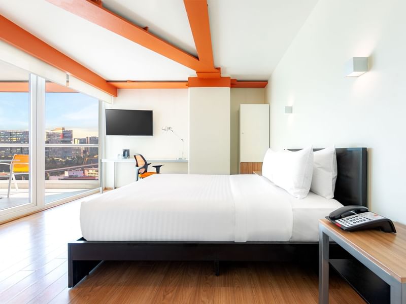 Un exclusivo espacio es ideal para que disfrutes de una estancia única en esta zona vanguardista. Esta habitación posee una terraza con la mejores vistas a la zona comercial donde podrás desayunar o descansar. Cuenta con una cama Queen Size, así como un amplio escritorio, amenidades, pantalla plana y mobiliario contemporáneo.