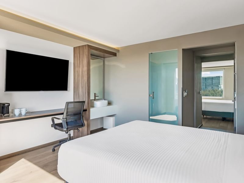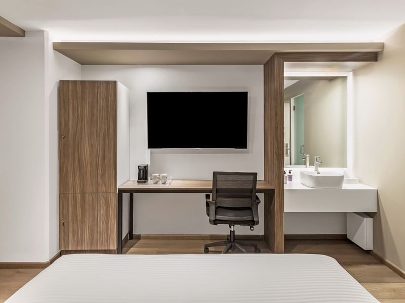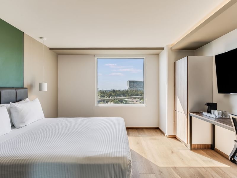 Un refugio cómodo y lleno de encanto. Esta habitación renovada te envuelve en una atmósfera acogedora para que descanses plenamente. Disfruta de su cama Queen, vistas panorámicas de la ciudad y detalles pensados para tu confort: escritorio, TV de 55”, cafetera, caja de seguridad, acceso a internet y un vanity con espejo iluminado. Todo listo para que te relajes y disfrutes. Espacio libre de humo.