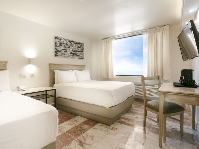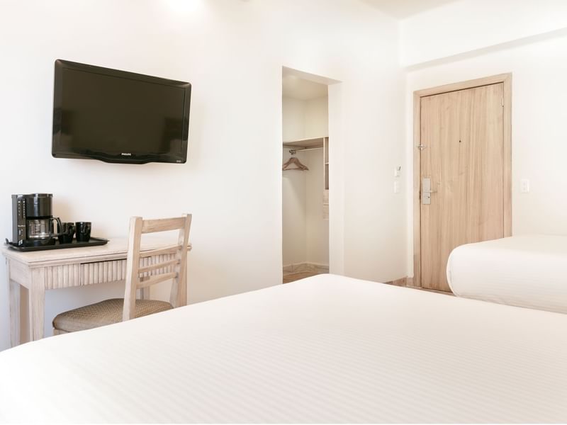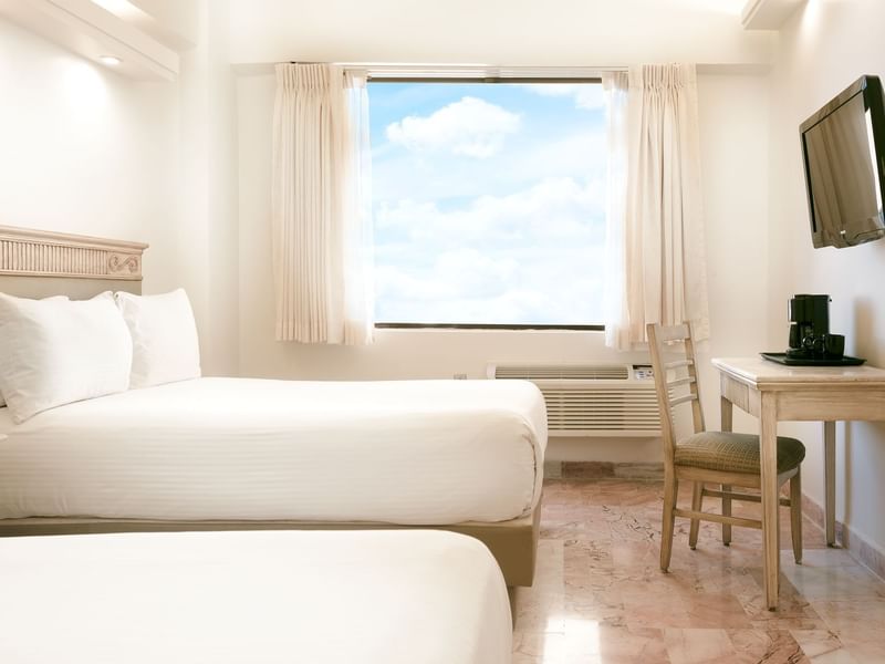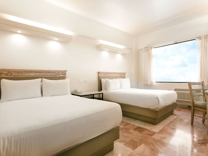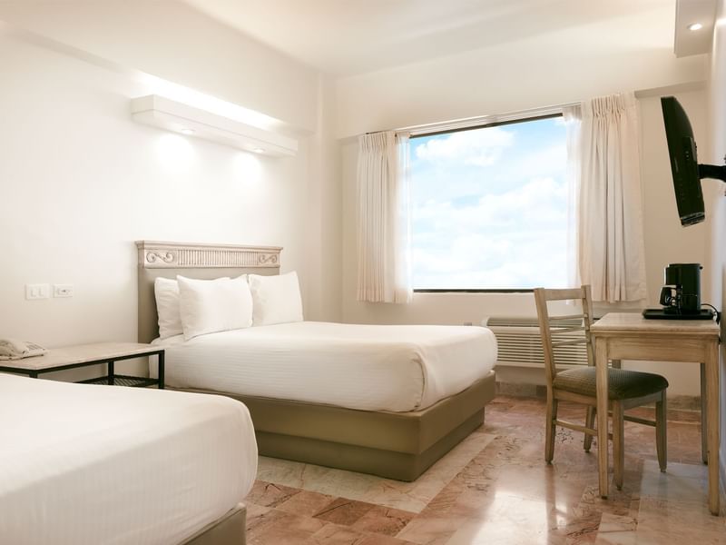 Ideal para compartir un viaje. Esta amplia habitación te brinda espacios encantadores con acentos locales para que disfrutes al máximo tu estancia. Cuenta con dos camas matrimoniales, mesa de plancha, plancha, cafetera, secador de pelo, pantalla de 32" y caja de seguridad. Somos Dog Friendly.