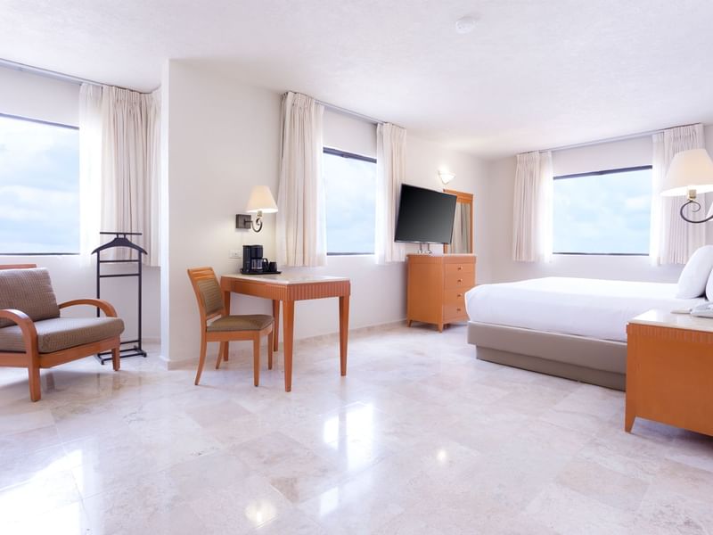 Ideal para vivir momentos inolvidables en esta encantadora suite. La amplitud de esta suite te ofrece una cama King Size, minibar, pantalla de 50", secador de pelo, cafetera Nespresso, mesa de planchar y plancha y caja de seguridad.