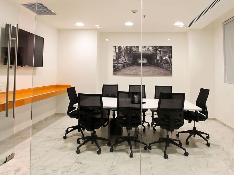 Mesa de conferencias, televisor en la pared y un cuadro mural en One Hotels