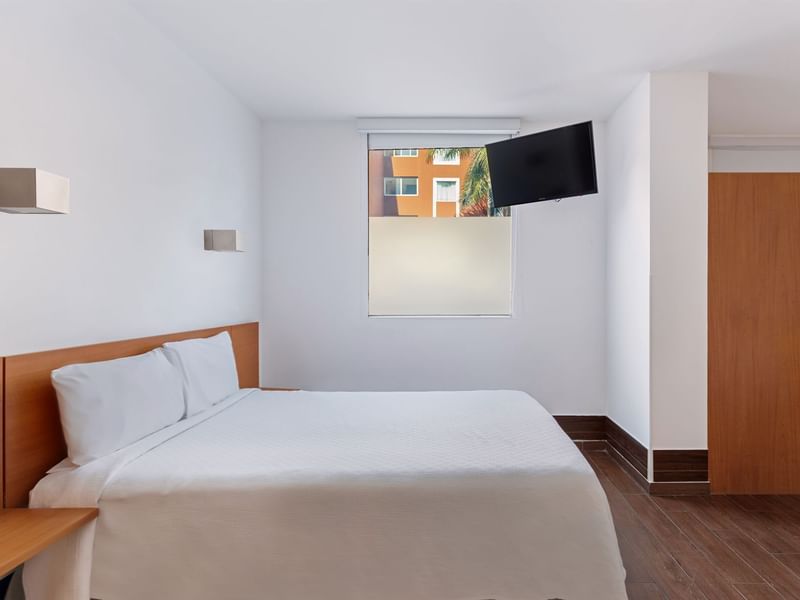 Un espacio cuidadosamente diseñado para que tengas una estancia agradable y segura, con facilidades especiales que te harán sentirte cómodo. Cuenta con los mismos servicios que las habitaciones estándar, pero con fácil acceso para silla de ruedas, pasamanos de seguridad en regadera, baño y tina, así como TV por cable, internet inalámbrico gratuito y cama Queen Size. Dispones de múltiples contactos para seguir conectado con el mundo. Nuestras amenidades son generosas y cuidan el planeta. Cuando llega el momento de dormir, las persianas black-out crearán la atmósfera ideal para tener dulces sueños.